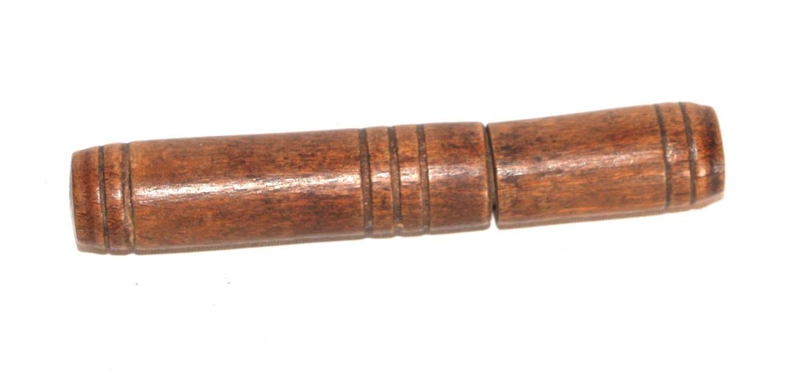 Nálhús úr viði, rennt, holað að innan. Lengd 8,5 cm, þvm. 1,4 cm. Rendur (sjö samtals) renndar á til skrauts. Tvær saumnálar leynast í húsinu.