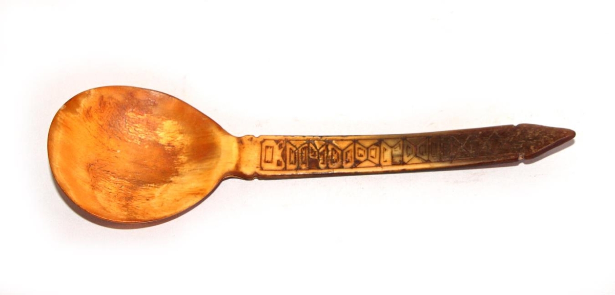 Spónn úr kýrhorni, 17 cm að lengd, skeiðin er mest 5,2 cm að breidd. Orðinn flagnaður og slitinn. Á haldinu er höfðaletur, fremur ólæsilegt. Þar stendur: b (?), a, ð (?), a, s, p, o, n - .... spon.