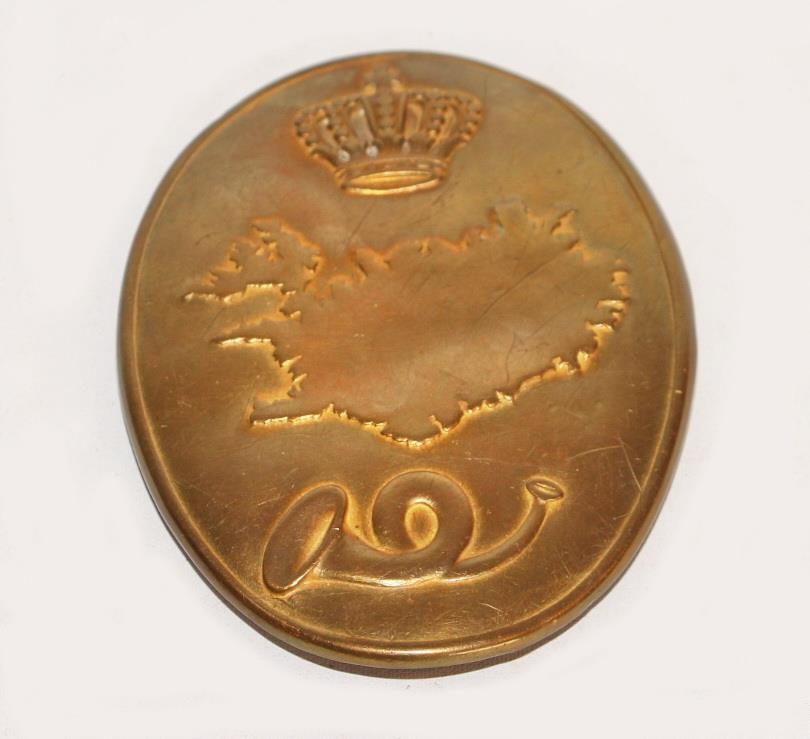 Skjöldur af pósttösku, sporöskjulaga úr messing, gylltur, stærð 8,3 x 6,4 cm. Með kórónu, Íslandskorti og póstlúðri.