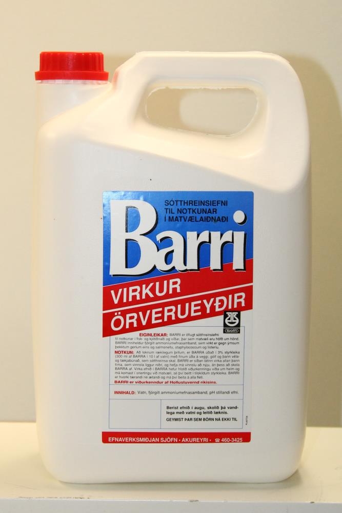 Barri er til notkunar í fisk- og kjöriðnaði. Efnið var virkst gegn ýmsum gerlum, svo sem salmonellu, staphylococcum og listeríu. Framleiðandi plastbrúsa: Plm/hf. Brúsinn tekur 5 lítra.