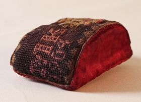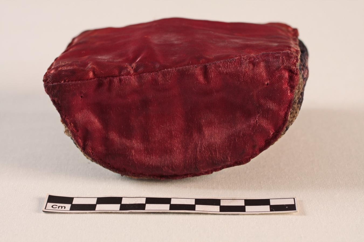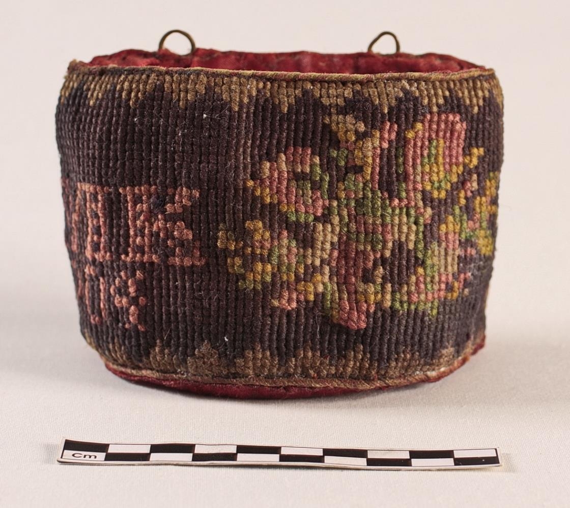 Þilkista. Útsaumuð í rósum með rauðum, gulum og grænum litum á svörtum grunni með pýramídamynstri allt um kring og fóðruð með rauðu silki. Stærð 10 cm á bakhlið að lengd (bogadregin að framanverðu). Mesta breidd um miðju 5 cm. Hæðin 8 cm. Útsaumað MK fangamark og ártalið 1904. Vírlykkjuhöld að ofanverðu til að hengja á þil.