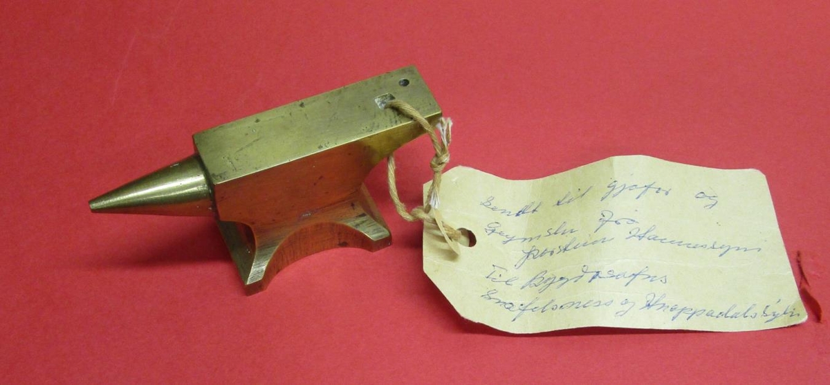 á miða stendur: ?þessi koparsteðji er smíðaður af Hannesi G. Kristjónssyni járnsmiði og bónda í Grunnasundsnesi á árunum 1910-1920, sendist til gjafar og geymslu frá Þorsteini Hannessyni til Byggðasafns Snæfellsness og Hnappadalssýslu.