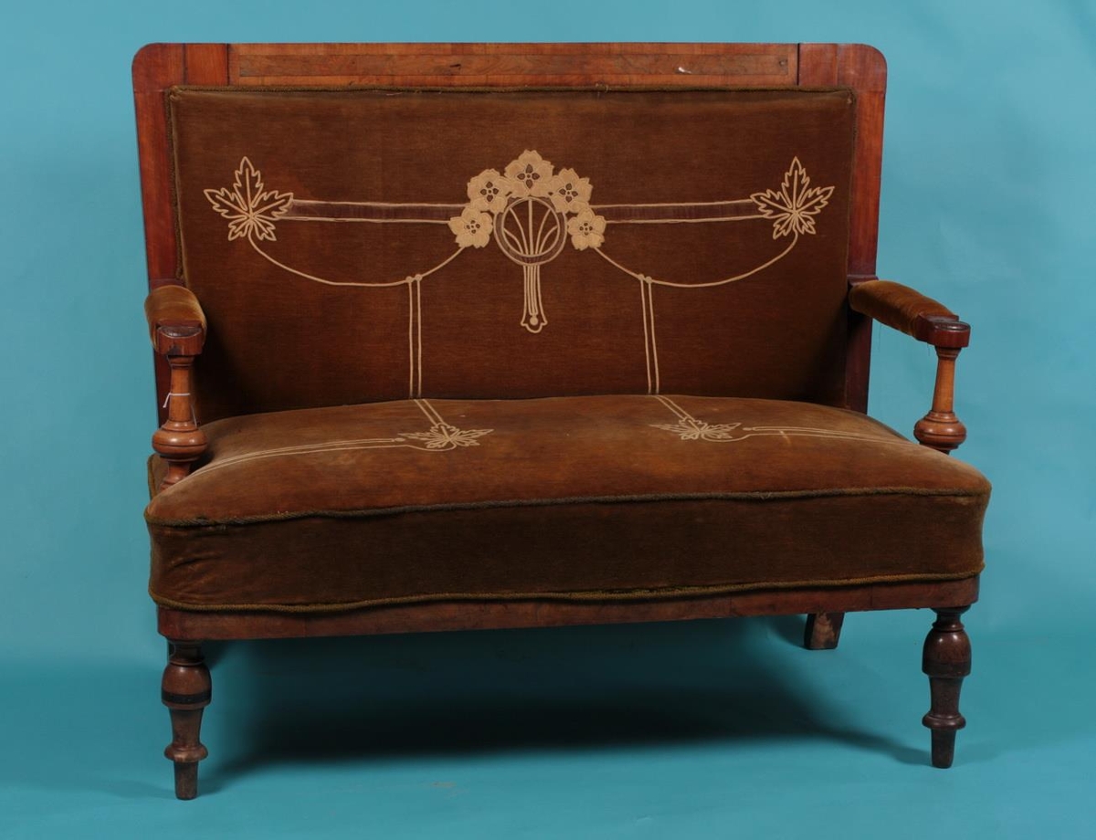 Tvíbreiður sófi úr harðviði, lakkaður, með grænu sléttu bómullaráklæði. Mesta breidd er 128 cm. Hæð á bak er 101 cm og hæð á arma er 67 cm. Framfætur eru renndir, einnig armstykkið upp að framan. Armarnir eru klæddir grænu flaueli og útskornir fremst. Fætur að aftan eru beinir og lítið eitt sveigðir, kantaðir og eru í einu tré upp bakið. Grindin er úr köntuðu tré, sem og baksláin, sem er spónlögð að framan.