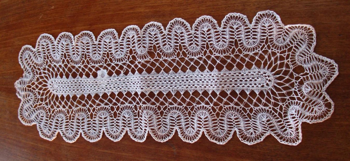 Borðdúkur úr bómull, hvítur, gimbaður. Heklaður að utan. Fíngerður þráður. Lengd 77 sm og breidd er 26 sm. Gefandi er Unnur Guðmundsóttir, Skógargötu 6, Sauðárkróki. Dúkinn gerði Magnúsína Guðmundsóttir fædd 1896 frá Minni-Brekku, þegar hún var rúmföst vegna berkla á Vífilsstöðum um 1920 - 25. Hún fékk berkla í mjöðm og átti lengi í stríði við þá, en hún var mikil handavinnukona og lá mikið eftir hana á tímabili. Nú er aðeins þessi dúkur eftir af því öllu segir gefandi.