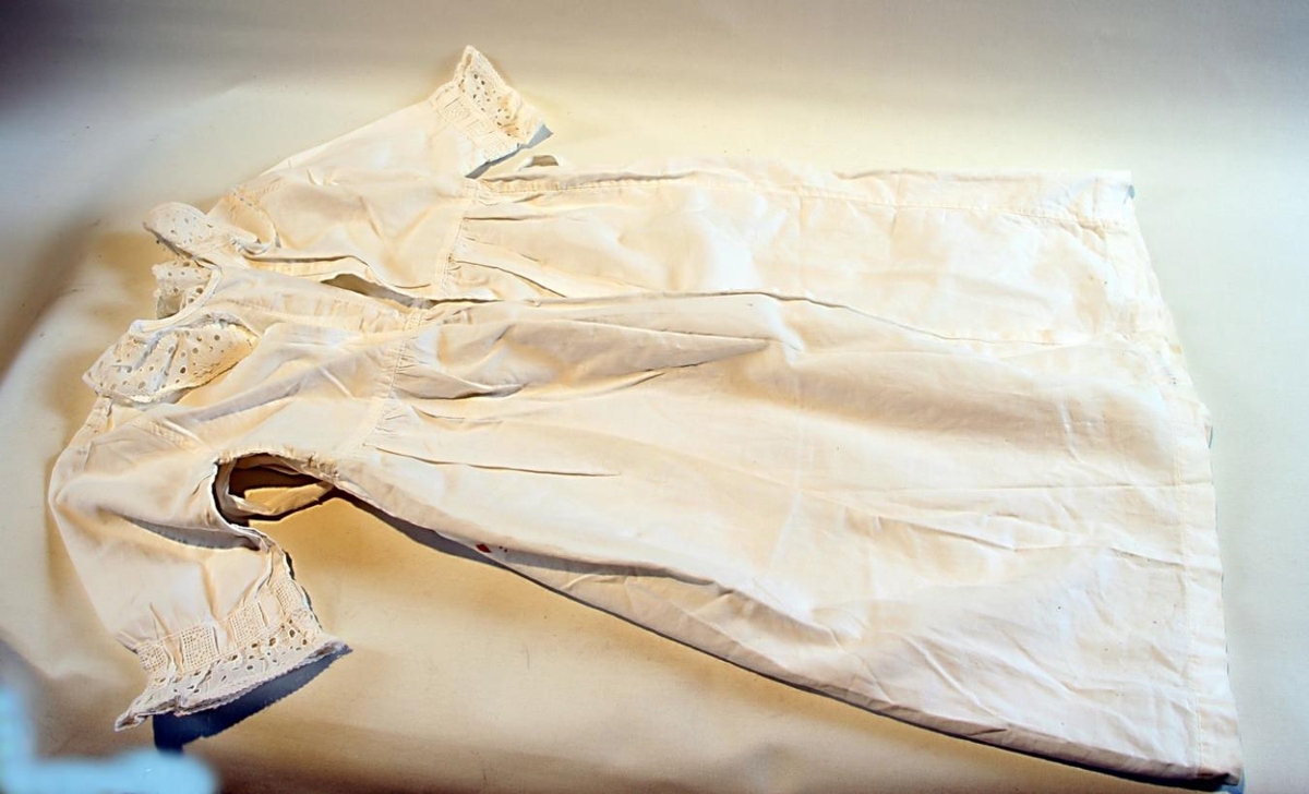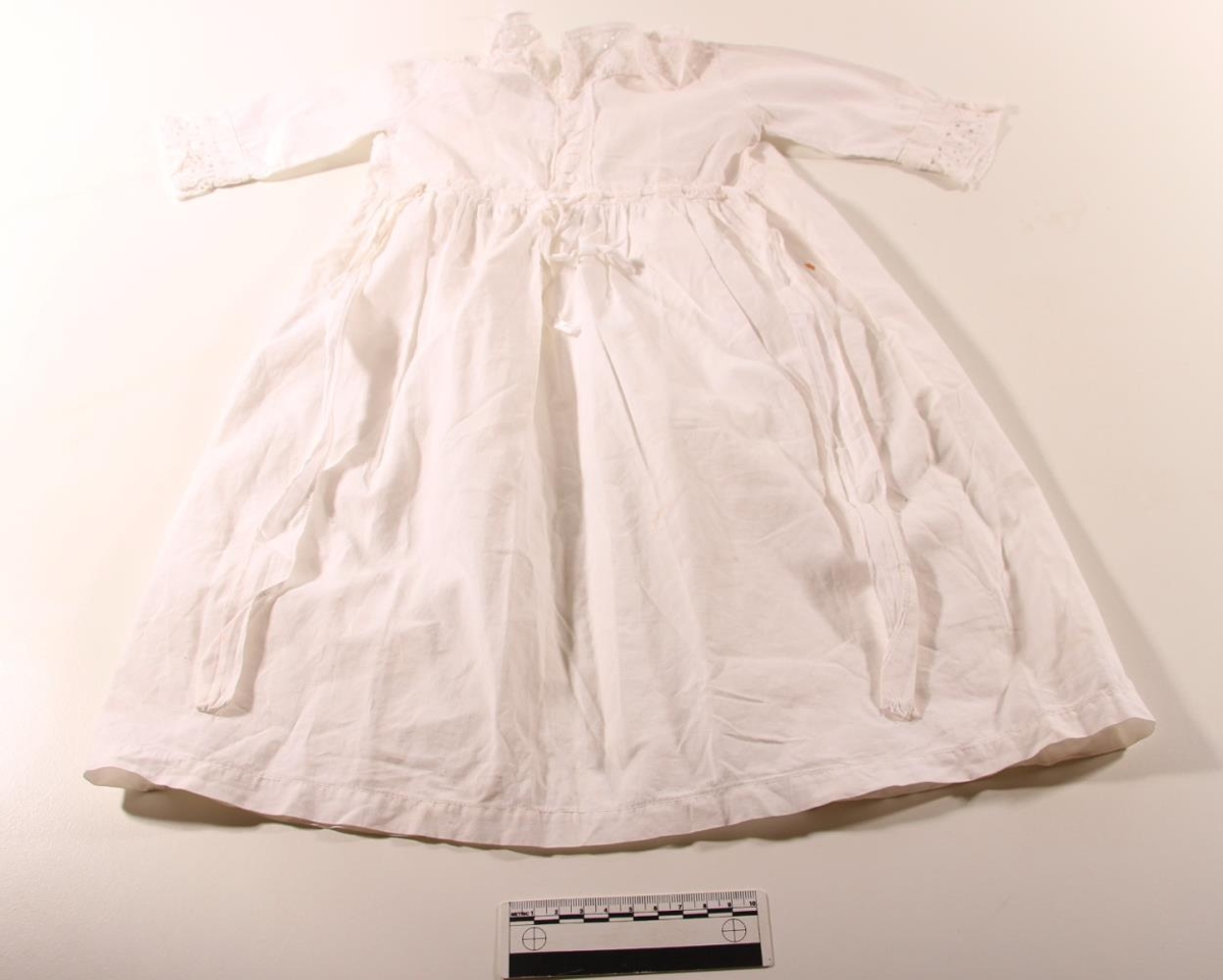 Kjóll úr hvítu lérefti, lengd alls um 51,2 cm, breidd með ermum 55 cm. Mjög fínt, mjúkt léreft, blúndukragi og blúnduermar. Hálsmálið er tekið saman með bandi. Opinn að aftan, en borði er festur á mittið framanvert og lausir borðar hnýta kjólinn saman að aftan. Framan á bringu og mitti er útsaumaður borði.