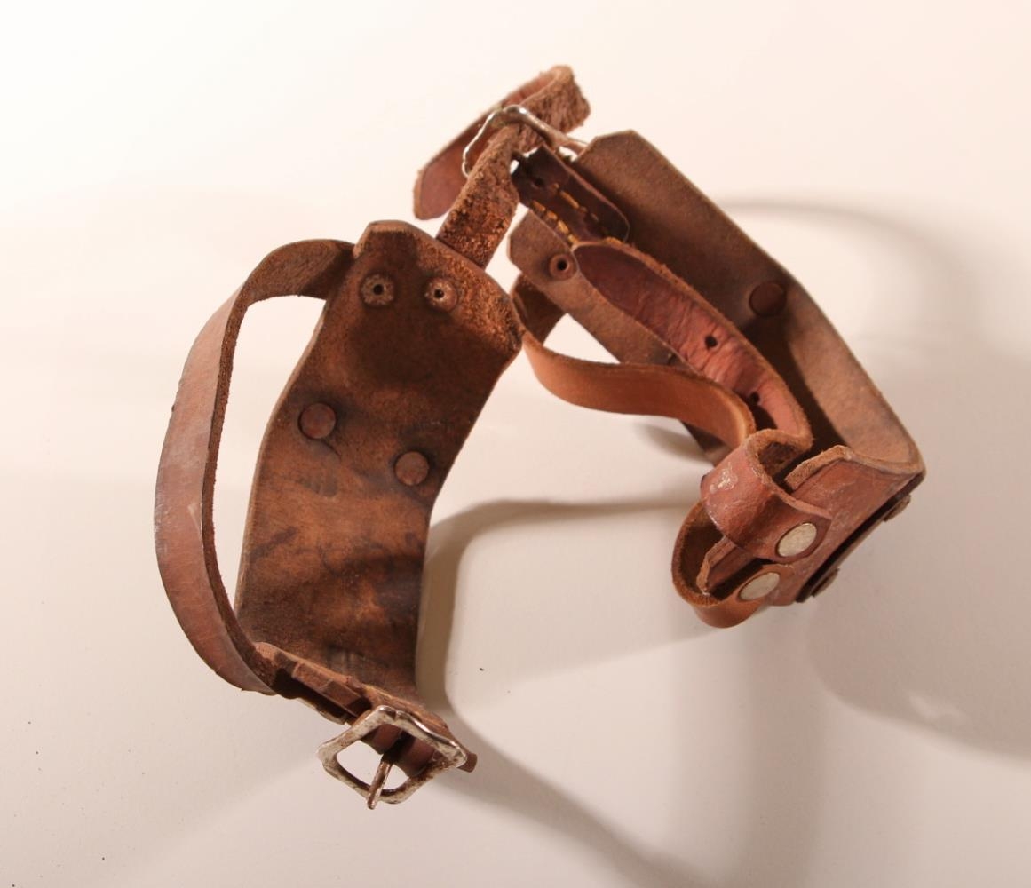 Mannbroddar, sem sagðir eru smíðaðir af Helga Jónssyni í Merkigarði. Þeir eru á járnplötu sem er fest með leðri. Ólar eru nýlegar. Breidd alls um 9,5 cm.