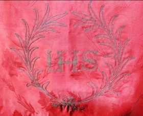 Altarisklæði úr rauðu damaskefni, 126 x 118 cm. Niðuráfaldur er efst af altarisbrúninni, með rauðu kögri. Á fald við kögur og framan á er saumað með gylltri (nú dökkri) snúru. Er krans framan á og inn í er IHS.
