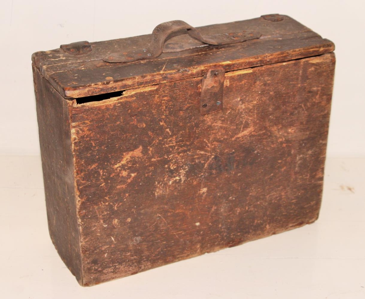 Skólataska úr fjölum, dökkbrúnlituð. Stærð: 37 x 28,5 x 12, 5 cm. Lokuð með leðurreim sem er hneppt á nagla. Leðurreimar tvær halda lokinu á og leðurreim er í stað handfangs. Reimarnar eru komnar úr gamalli ístaðsól. Léleg taska, hróflað saman og saumurinn orðinn ryðgaður enda er taskan frá 1932.