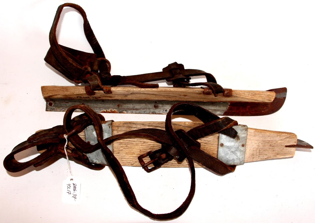 Skautar úr járni, furu og leðri. Skautarnir sem eru svokallaðir langhlauparar eru 38 cm langir. ,,Sólinn" er úr tré, furu, og er kantaður í endanum en þríhyrningslaga í miðju. Flatur að ofan, fyrir fótinn og eru leðurólarnar festar á tréð með járnskrúfum á hæl og tá.