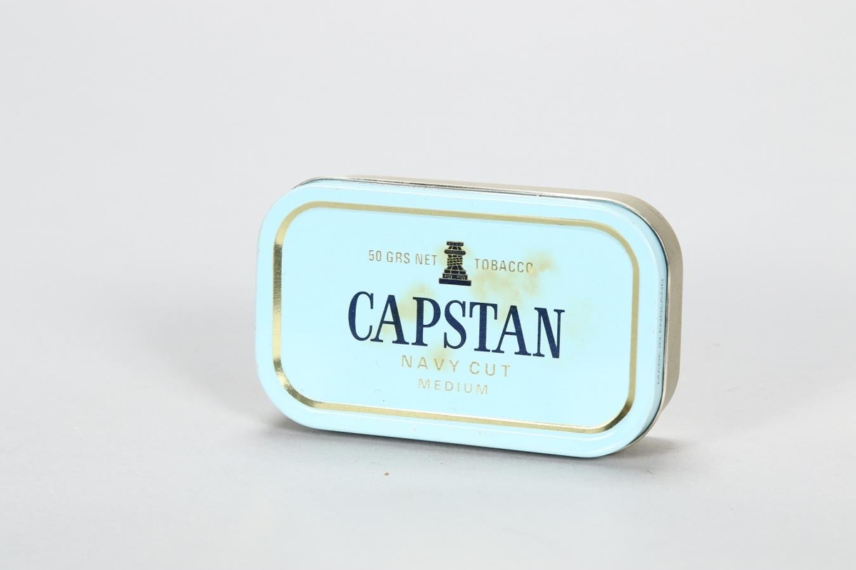 Blikkdós undan pressuðu Capstan navy cut píputóbaki.