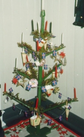 Jólatré úr furu, grænmálað með silfurlit neðan á greinum, hæð um 125 cm. Tréfótur úr krosslögðum fjölum, sexstrend súla með 12 greinum upp við topp er fjögurra arma krossviðarstykki smeygt ofan á súluna og myndar hún fjórar greinar. Upp frá þessum greinum er sívalur stjaki/fótur fyrir stórt kerti, laust smeygt ofan á, eins og loki. Sennilega úr hrífu- eða skófluskafti. Hver álma er gerð úr ferköntuðum spírum sem hafa verið tálgaðar þannig að kantar eru farnir. Álmurnar ganga sennilega um 1 cm inn í súluna. Neðstu álmur eru 37 cm langar, næstu álmur eru 29 cm langar, efstu álmur eru 21 cm langar. Krossviðaraálmurnar eru um 7 cm langar (alls 18 cm á breidd). Upp úr þessu efsta stykki stendur sívali kertastjakinn 23 cm hár fyrir toppkertið.