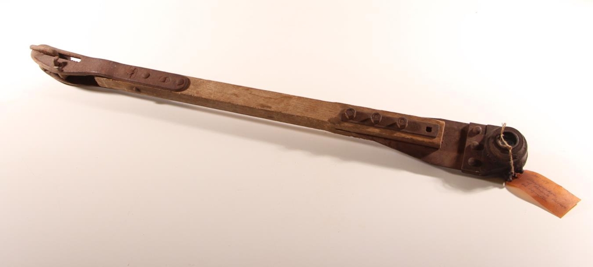 Hlaupastelpa úr furu og járni. Lengd alls um 88,5 cm. Hún mun vera af Farmall dráttarvél, árg. 1945.
