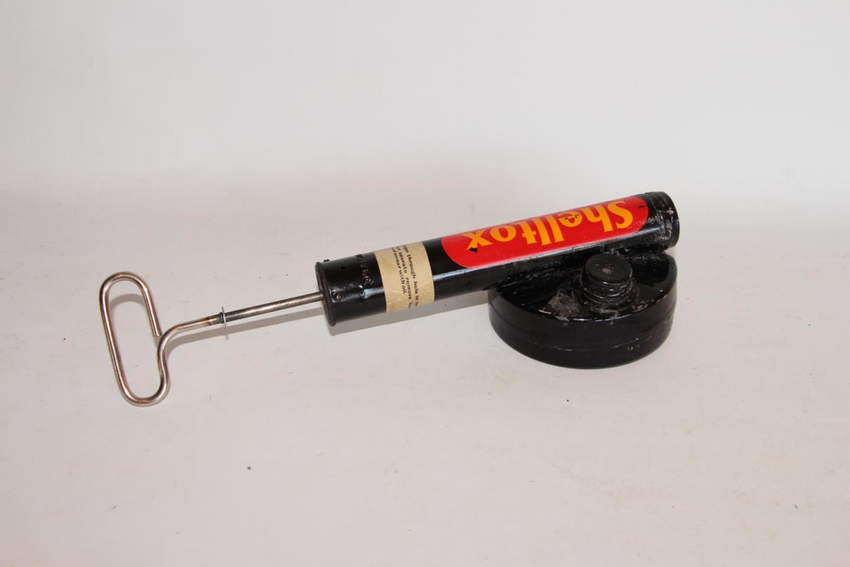 Mölflugueitursúðari úr járni, svartmálaður hólkur 21 cm langur og 3,5 cm í þvm. með flötum hringlaga bauk á hlið hólksins (sjálfur eiturgeymirinn: 3,5 cm á hæð og 11 cm í þvm). Handfang er mjó járnlykkja sem gengur ofan í tanga. Útdregin er hún 22 cm. Er plata fest á tangann inni í hólknum og við snögga hreyfingu fram á við dælist loft í geyminn og við það úðast efnið fram. Á rauðum fleti stendur gulum stöfum: Shelltox kills flies and other household insects.
