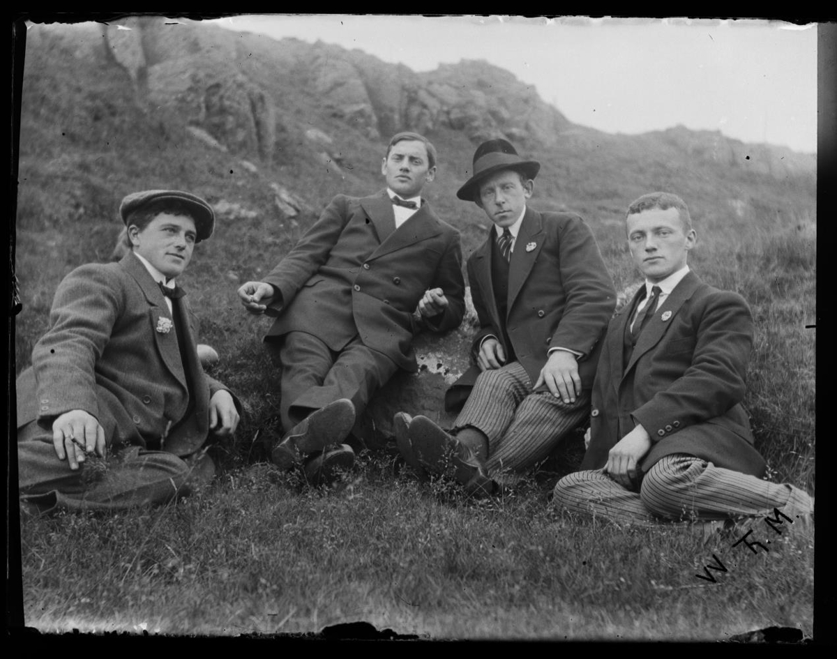 Fjórir prúðbúnir karlmenn hvíla sig í brekku í Stykkishólmi.