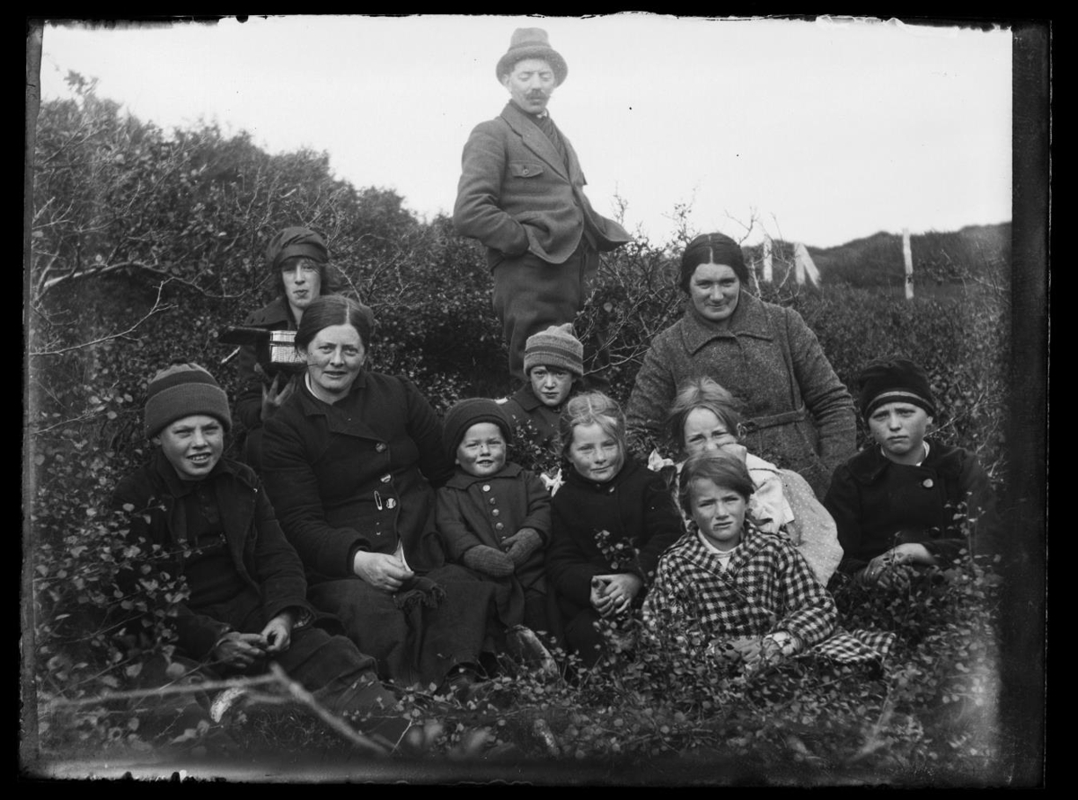 Tvær konur, maður og átta börn sitja úti í við kjarr og stilla sér upp fyrir ljósmyndarann. Börnin broshýr.