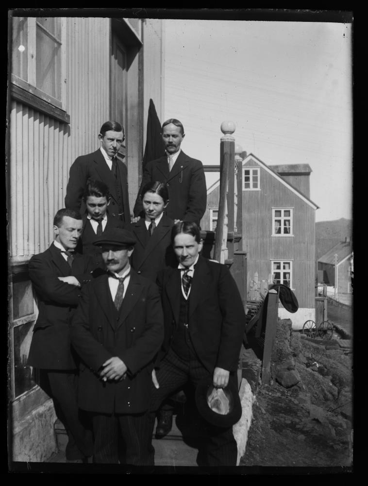 Sjö karlmenn standa á tröppum við hús í Stykkishólmi.