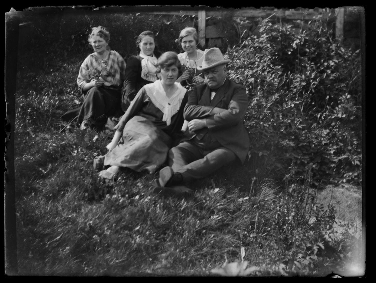 Karl og fjórar konur sitja í afgirtum garði við trjágróður.