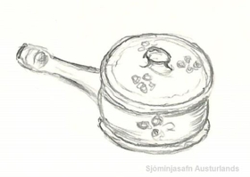 Leirpottur með skafti úr búi foreldra gefanda. Merki: Seide in Faaborg.