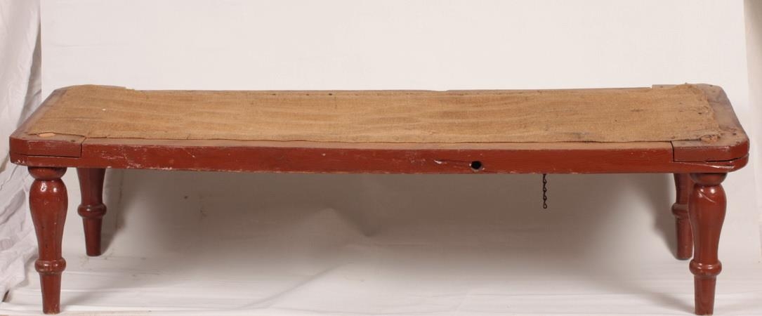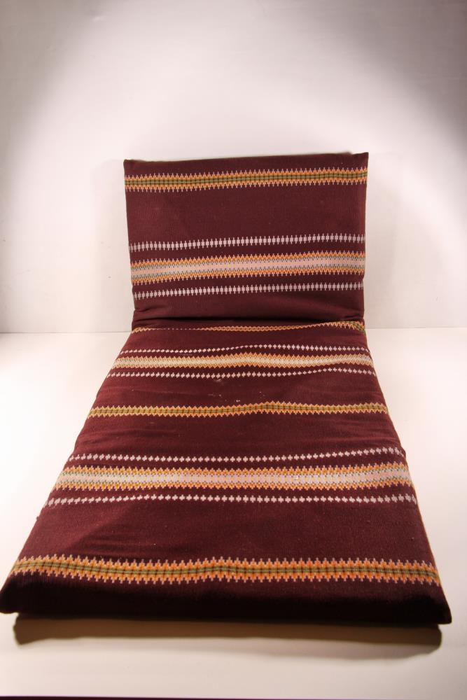 Dýnan sem fylgir er 140,5 x 59 x 5 cm á stærð. Áklæðið er heimaofið úr ull, ekki keypt. Það er röndótt, grunnlitur er dökkbrúnn og aðrir litir eru tvenns konar grænir, appelsínugulur og grár. Á bakinu er lakaléreft. Glæsilegt handverk og góð smíð.