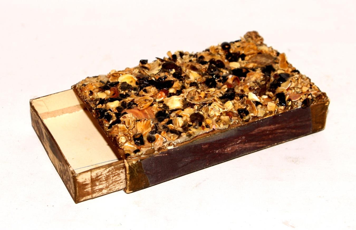 Eldspýtnabox, úr pappa. Lengd 11,2 cm, breidd 7 cm og hæð 2,3 cm. Skúffan er tvískipt. Í þeim er stimpill V.S. Siglufjörður. Botninn á umslaginu var gylltur og að ofan er skeljamulningur límdur á og lakkað yfir. Fékkst frá Siglufirði (gjöf) um 1960. Einskonar framleiðsla fyrir ferðamenn, á fyrstu stigum handverks. Í slíkum tilgangi. Óvenju ljótt.