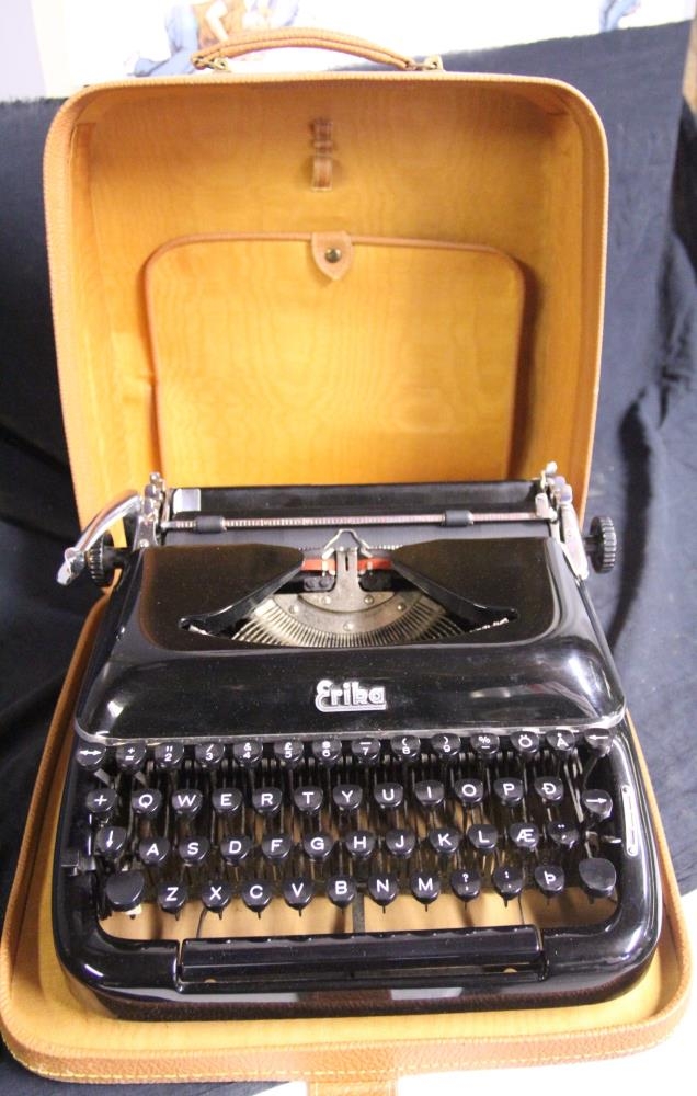 Ritvél (35 x 35 cm, Hæð 16,5 í tösku). Ritvélin sjálf er um 21 x 28,5 cm og 12 cm há. Hún er svört, framan á henni stendur ,,Erika". Taskan utan um vélina er gulbrún úr einhverskonar leðurlíki. Inn í loki töskunnar er vasi fyrir blöð og lykkjur fyrir penna, botninn er hins vegar fastur undir ritvélinni. Hvort tveggja taskan og vélin eru vel með farin og að því er virðist lítið notuð.