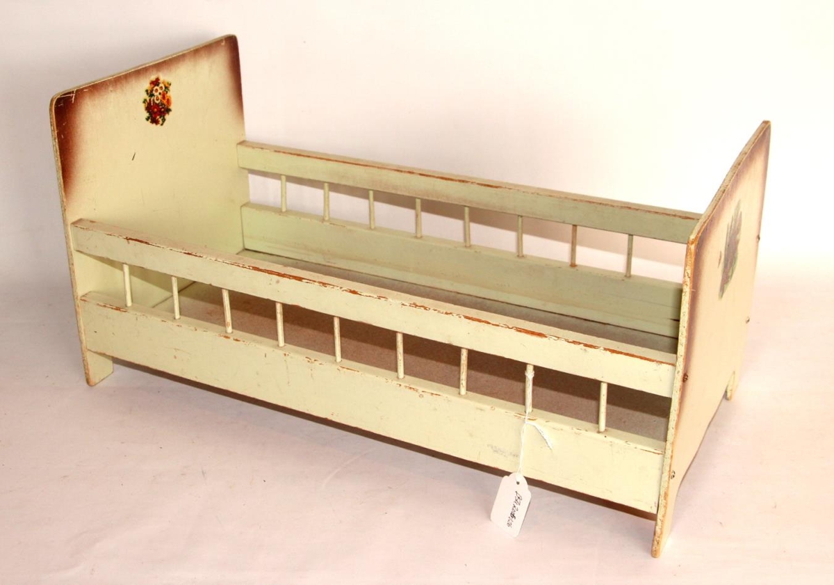 Brúðurúm úr tré og pappa. Stærð 50 x 25 cm. Hæð á gafl er 24 cm. Málað ljósgrænt að lit, á fótgafli utanverðum er á límd mynd af fiski, á innanverðum höfuðgafli er álímd blómamynd. Gaflarnir eru úr krossviði, hliðar eru úr tré með mjóum pílárum úr tré (furu). Botninn er úr pappa. Höfuðgaflsmegin er annar fóturinn brotinn af.