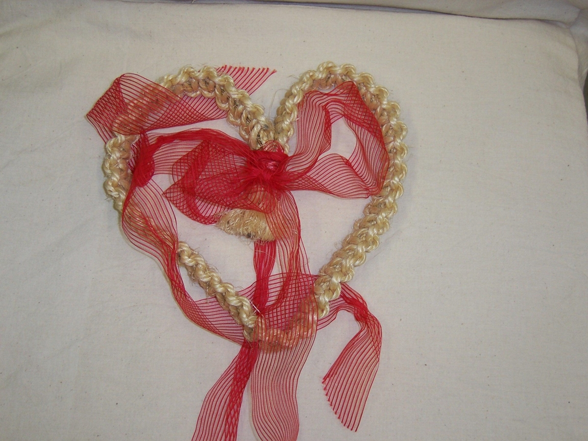 Hjarta hnýtt úr grófu snæri. Rauð slaufa bundin á hjartað með löngum endum.