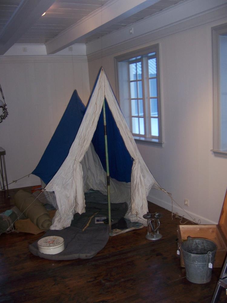 Tjald úr bláum segldúk, stangirnar eru gerðar úr kústsköftum. Botn fylgir úr vatnsheldu efni. Heimasaumað af gefanda um 1960. Guðrún og Áskell Gunnarsson maður hennar fóru mikið í útilegur með börn sín lítil og notuðu þá þetta tjald árum saman. Telst líklega fjögurra manna tjald. Utan um tjaldið er poki úr vatnsheldu efni sem Guðrún saumaði einnig.
