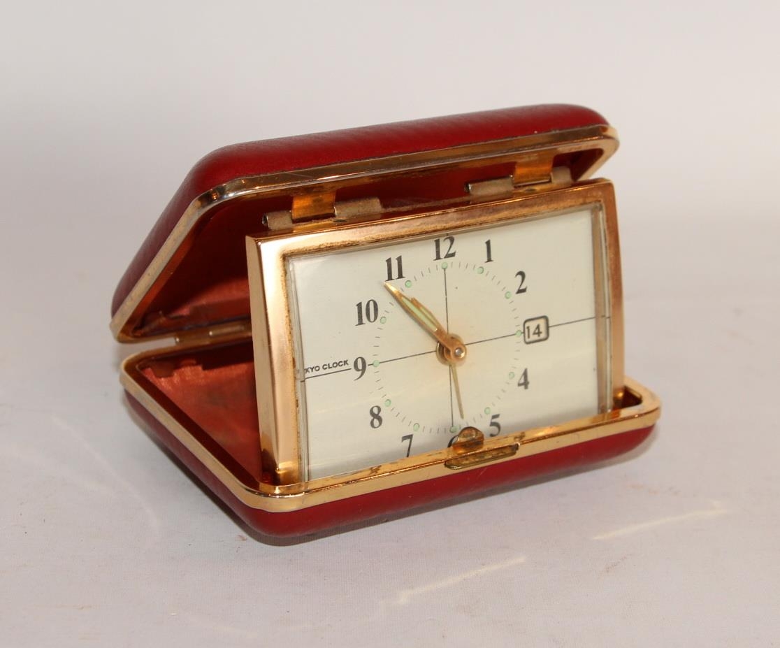 Vekjaraklukka í leðurklæddu, rauðu, stálboxi. Stærð 9 x 7 x 3,2 cm. Silkiklætt að innan, þar númer 7001. Klukkan, sem er keypt að Krithóli um 1970, fellur ofan í hulstrið, nema í notkun er hún reist upp úr kassanum. Eins konar ferðaklukka. Skífan er hvít með grænum klukkustundapunktum og svörtum tölustöfum. Vísarnir eru gylltir með grænu í.