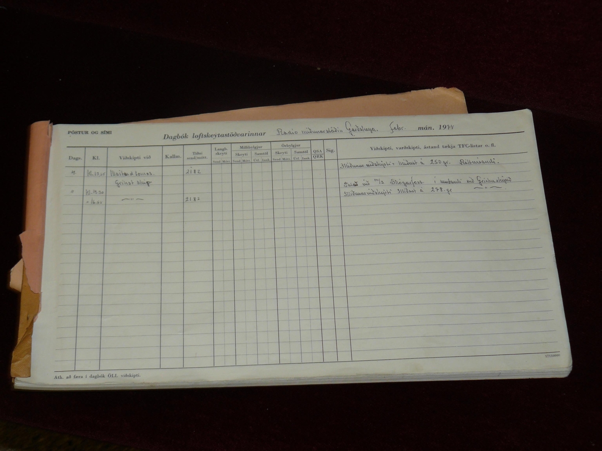Dagbók Loftskeytastöðvarinnar Radíó miðunarstöðvar á Garðskaga. Vitavörður á þessum tíma var Sigurbergur H. Þorleifsson (1905 - 1989). Það er mjög líklega Sigurbergur sem hefur ritað í þessa dagbók.
