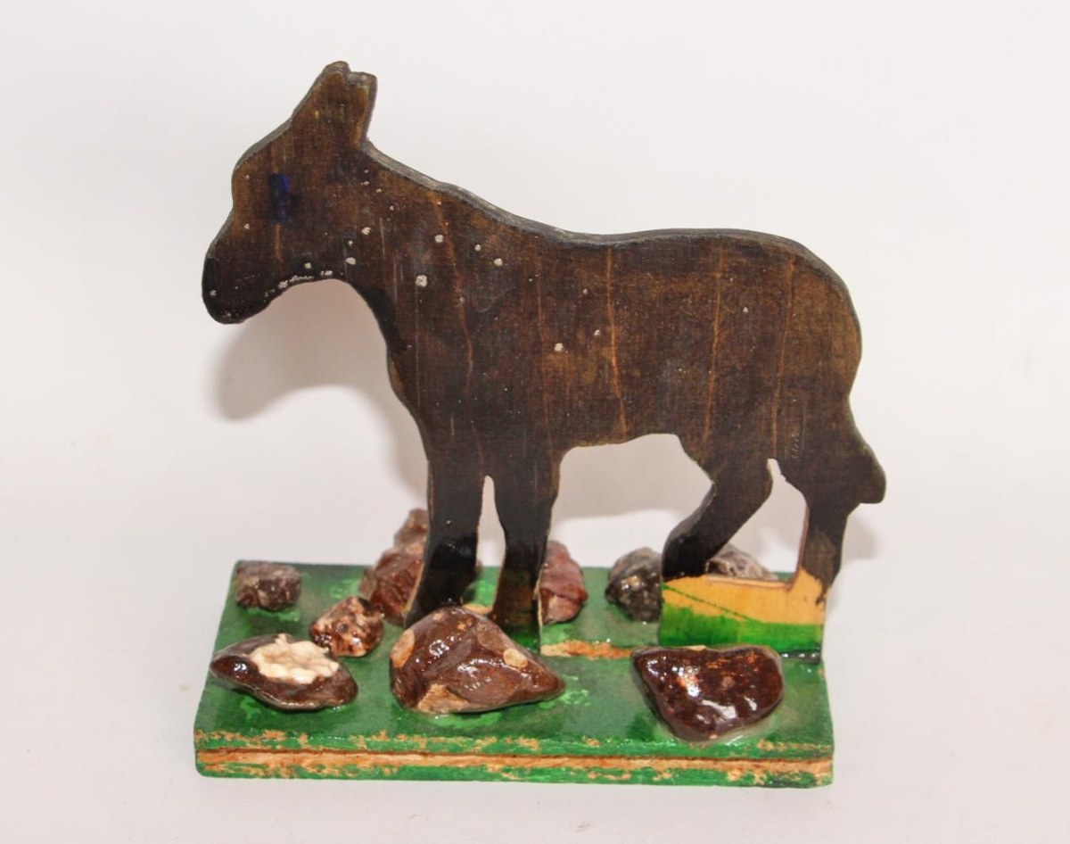 Asni úr krossvið, allur svartlitaður nema einn fótur. Hann er sokkóttur á öðrum framfæti. Hæð hans er 13 cm. Hann stendur á grænum palli 10,9 x 5,7 cm sem límdir eru á níu smásteinar.
