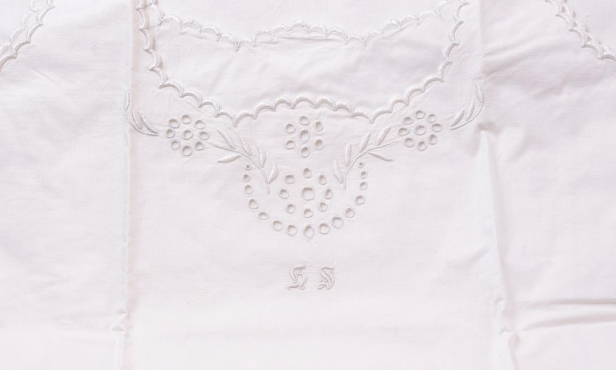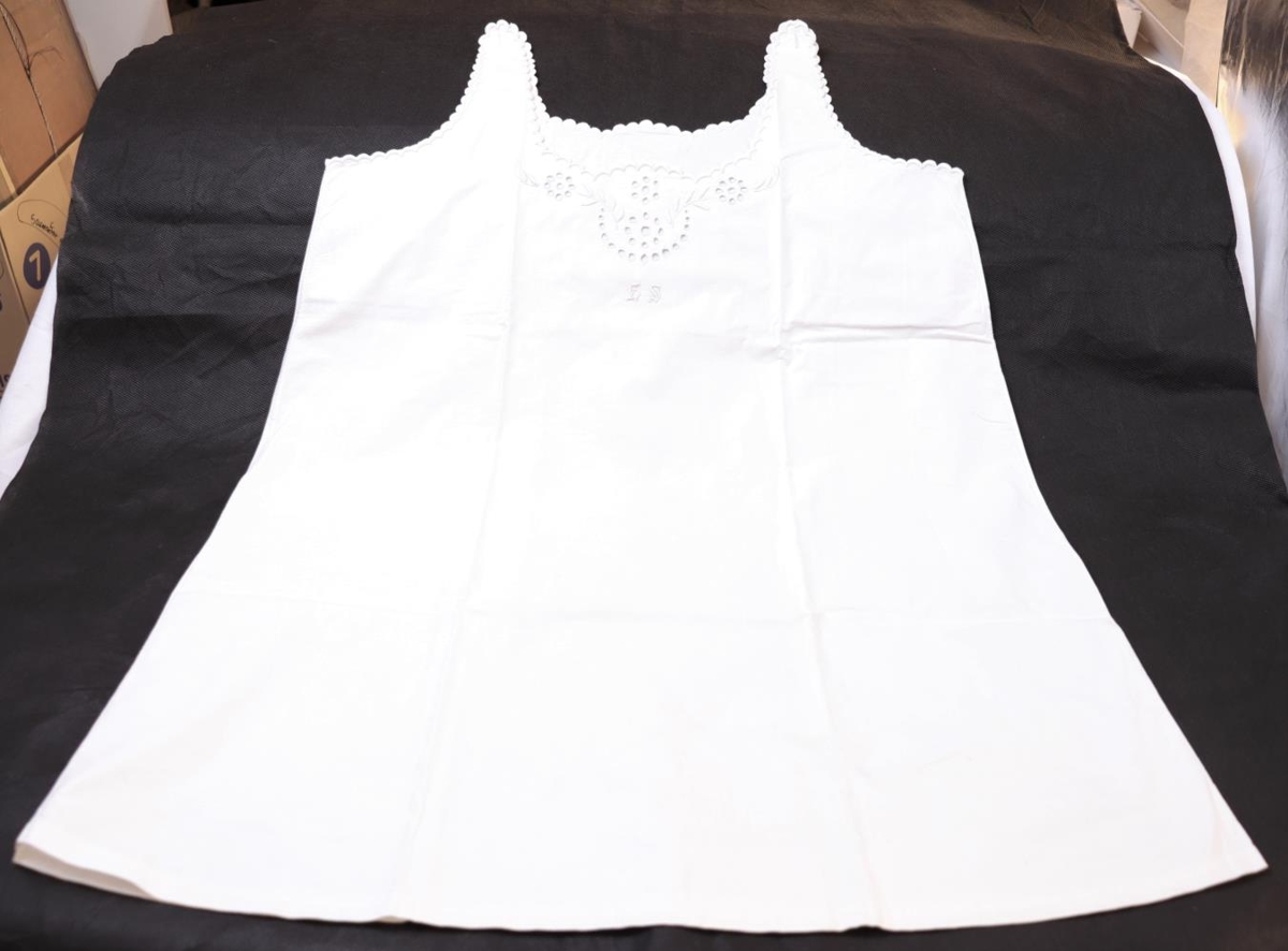 Nærskyrta með hlýrum. Hvítt bómullarefni, með enskum og frönskum útsaumi. Lokast á öxlum með tölu sínu hvoru megin. Saumuð af Helgu Sigurðardóttur (9.4.1908 - 16.10.2000) í Hraunsási í Hálsasveit. Merkt með fangamarki í útsaumi á brjósti: H.S.