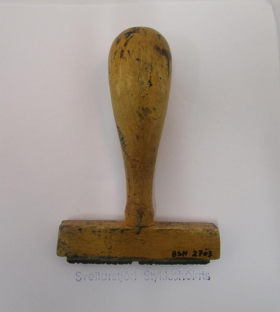 Ljós viðarstimpill sem á stendur: Sveitarstjóri Stykkishólms. Munirnir BSH 2688 - BSH 2703 komu saman og voru notaðir á hreppsskrifstofu og síðar bæjarskrifstofu Stykkishólms.