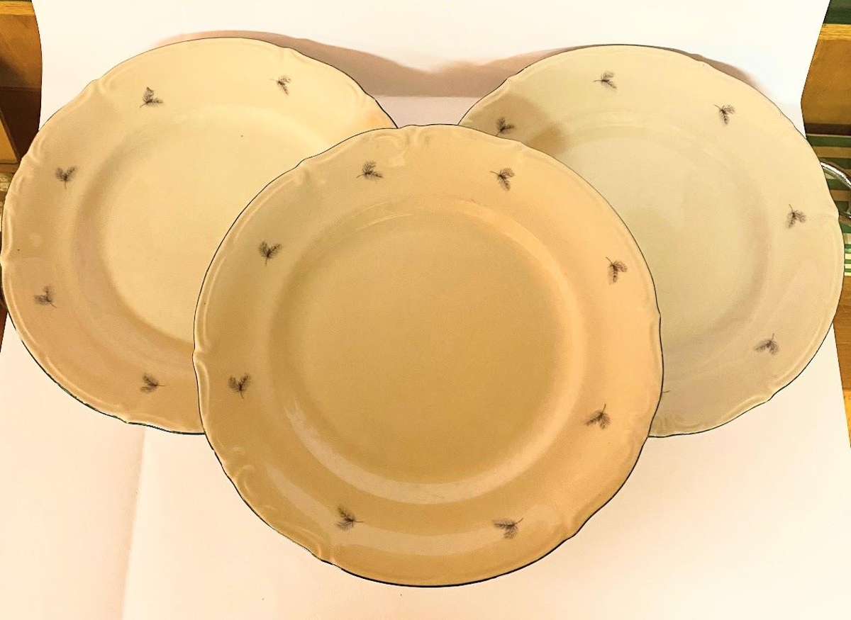 Matardiskur úr stelli. Ljósgulbrúnir diskar með grænni rönd og fínlegum laufblöðum. Framleitt í Póllandi.