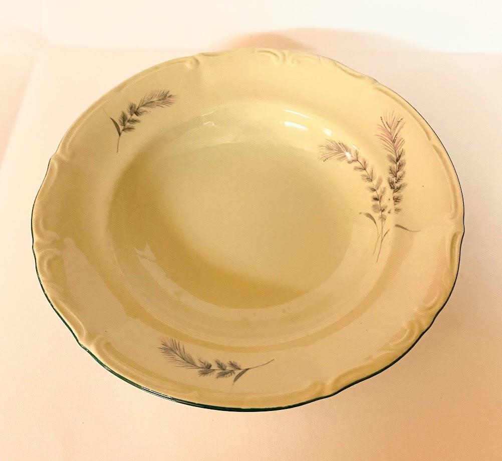 Djúpur diskur úr matarstelli. Ljósgulbrúnir diskar með grænni rönd og fínlegum laufblöðum. Framleitt í Póllandi.