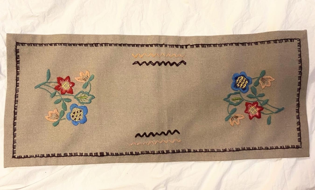 Aflangur dúkur, útsaumaður, svokallaður Gefjunardúkur