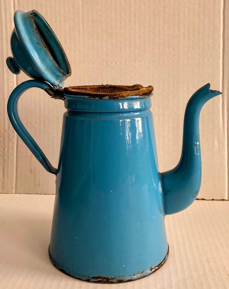 Kaffikanna, lítil. Blá á lit. Er úr dánarbúi Theodórs Gunnlaugssonar (f. 1901) og Guðrúnar Pálsdóttur (f. 1902) sem bjuggu á Bjarmalandi í Öxarfirði, N-Þing.