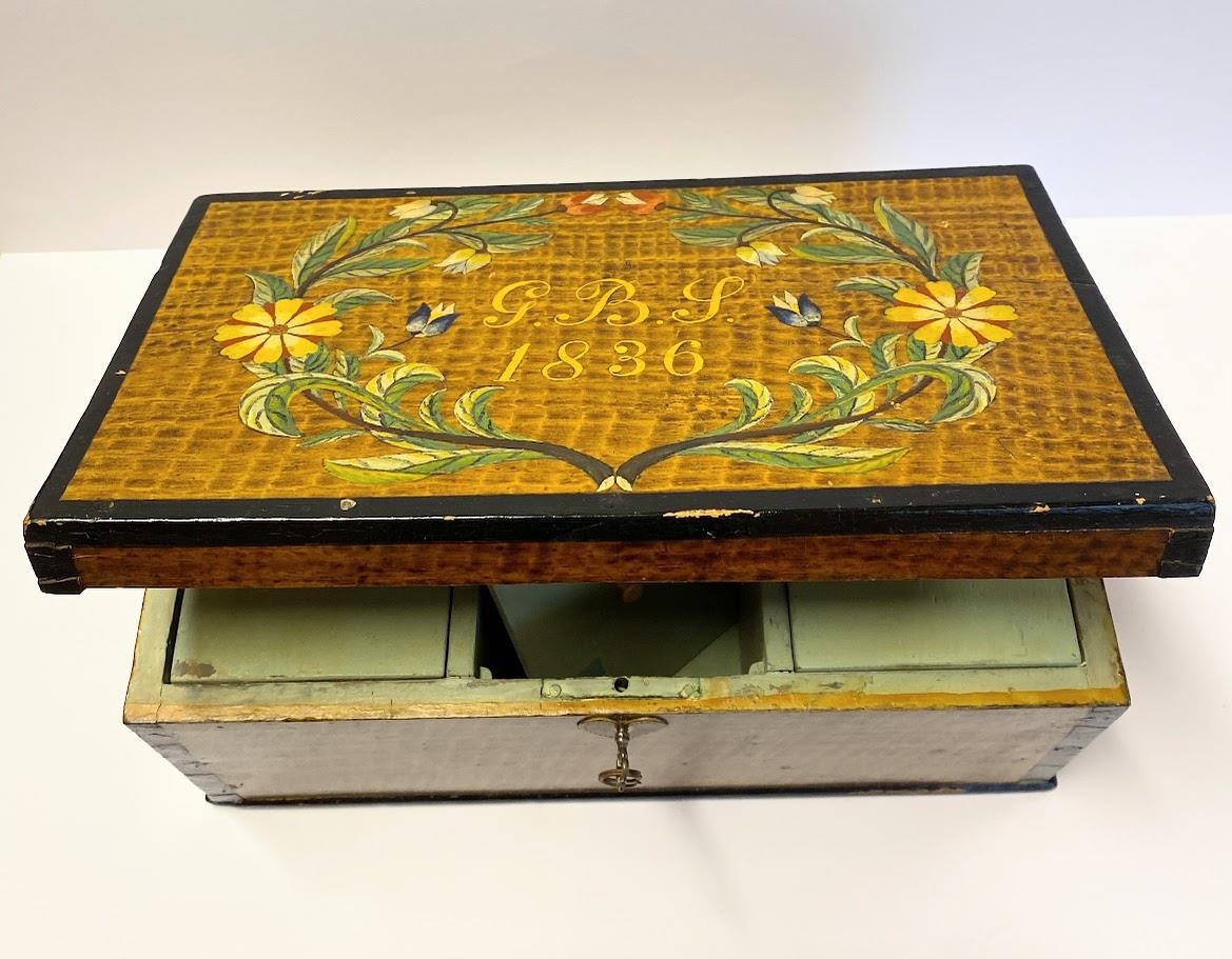 Kistill frá Ferjubakka. Grænmálaður að innan með þremur hólfum með lokum yfir sem hvert skiptist í 2 hólf, þ.e 6 hólf alls. Lykill fylgir. Merktur G.B.S 1836. Stafir og ártal innaní máluðum blómabekk. Gefandi Fjóla Einarsdóttir ekkja Arnbjörns Ólafssonar.