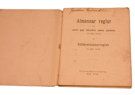 Titill: Almennar reglur um varnir gegn útbreiðslu næmra sjúkdóma 12. okt. 1912 og Sótthreinsurnarreglur 12. okt. 1912. Höfundur Guðmundur Björnsson (1864-1937) landlæknir. 46, [2] bls.