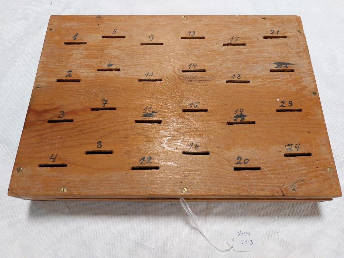 Peningakassi úr tré, með 24 hólfum. Merktur Aurasjóði barna. Tilheyrði Barnaskóla Húsavíkur.