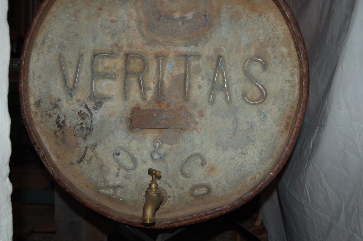 Olíu-/Bensínfat, fyrir daga sölustöðva nútímans var eldsneyti á dráttarvélar flutt og afgreitt á tunnum sem þessum. Á henni stendur Veritas.