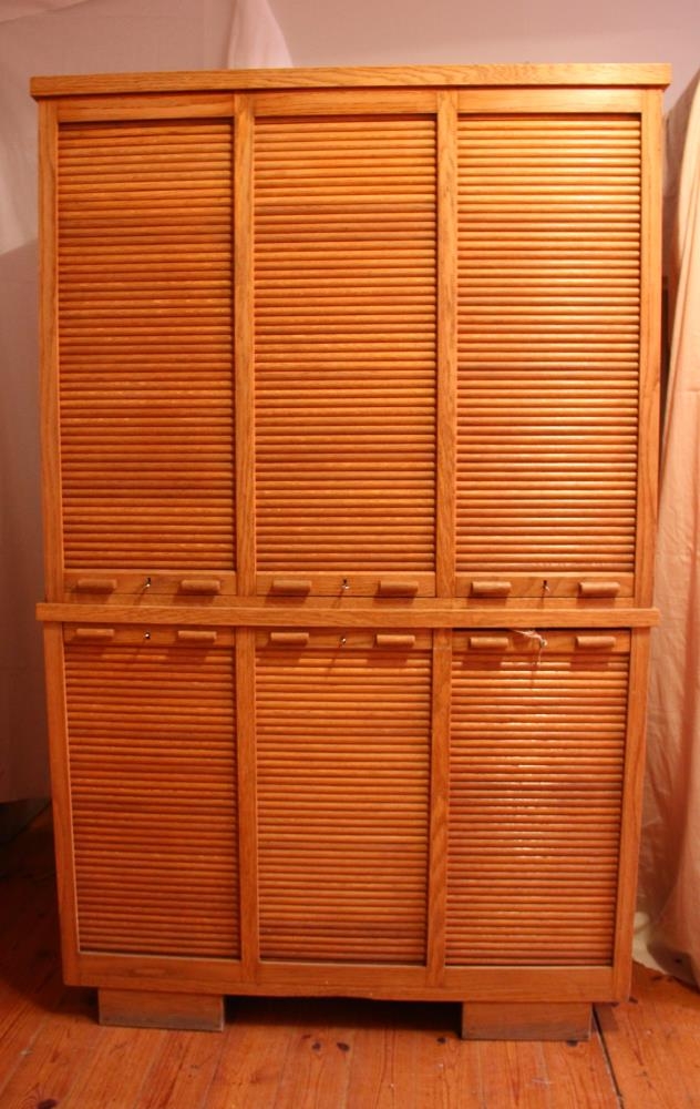 Skrifstofuskápur úr eik með rennihurðum og skúffum, m.a. fyrir A–4 blöð. Skápurinn mun hafa verið í notkun á skrifstofum KEA.