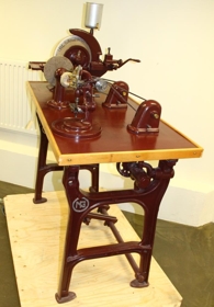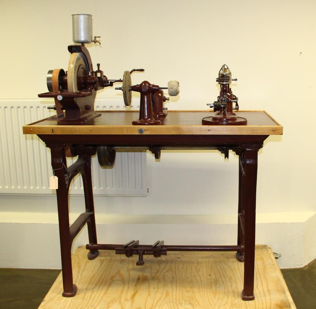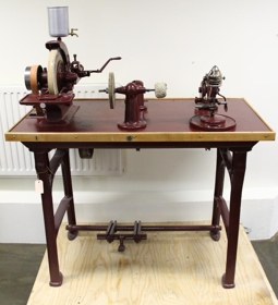 Glerslípivél til að slípa gler í stofuskápa. Einnig er á vinnuborðinu bor til að gera göt í gler fyrir höldur. Vélin er úr málmi á vinnuborði úr viði, máluð í rauðbrúnum lit en vatnsboxið bronsað. Á hliðum fótanna er merkið NG, en framan á borðinu er lítil plata sem á stendur: Triumph.