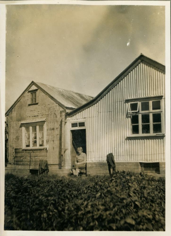 Ung kona situr í dyrum bárujárnshúss. Við myndina er skrifað: Katrín Söbeck í bæjardyrunum á Iðu.