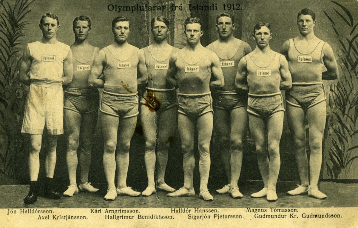Hópmynd af gómuköppum frá Íslandi sem kepptu á Ólympíuleikunum í Stokkhólmi 1912.