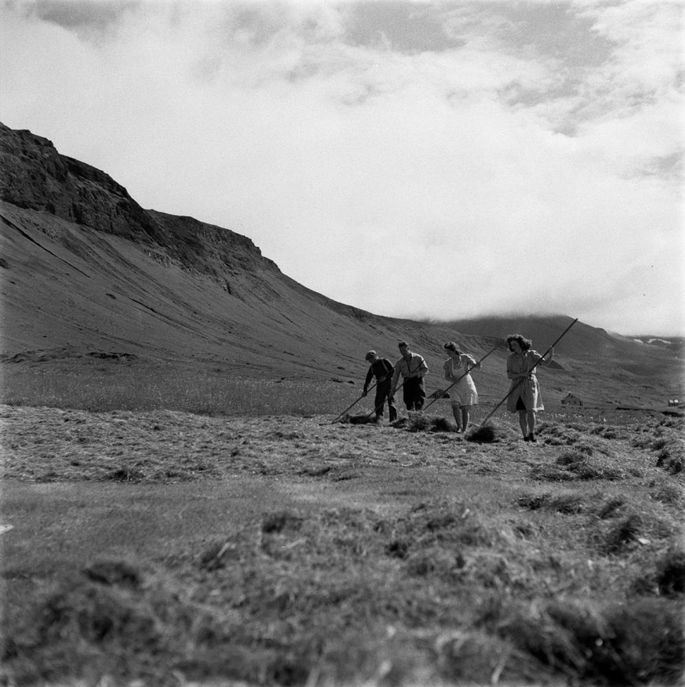 619 Snæfells- og Hnappadalssýsla. Heyskapur í Mávahlíðartúni. Fólk að raka.