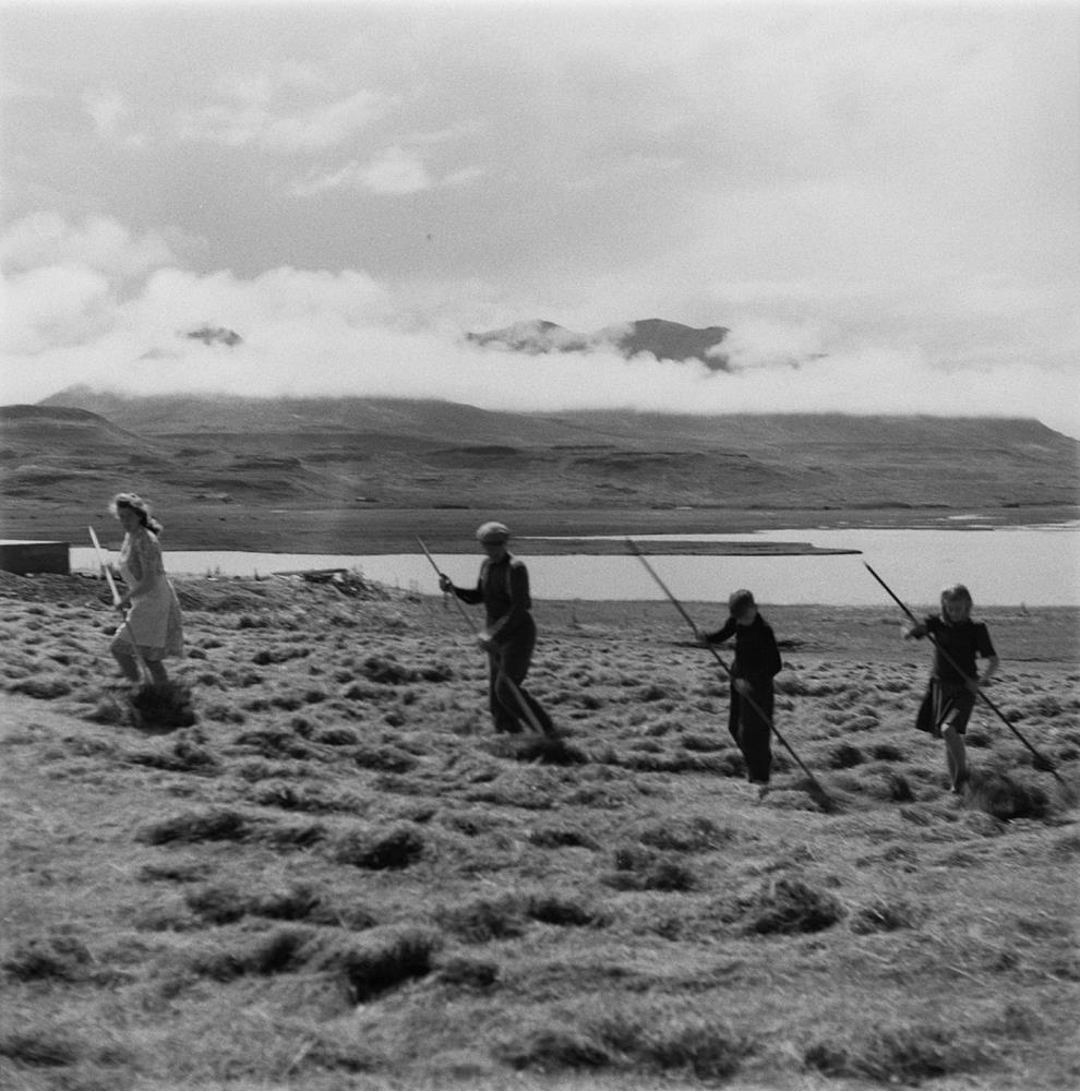 620 Snæfells- og Hnappadalssýsla. Heyskapur í Mávahlíðartúni. Kona, karlmaður, unglingsdrengur og unglingsstúlka raka. Elínborg Ágústsdóttir (f. 17.09.1922)