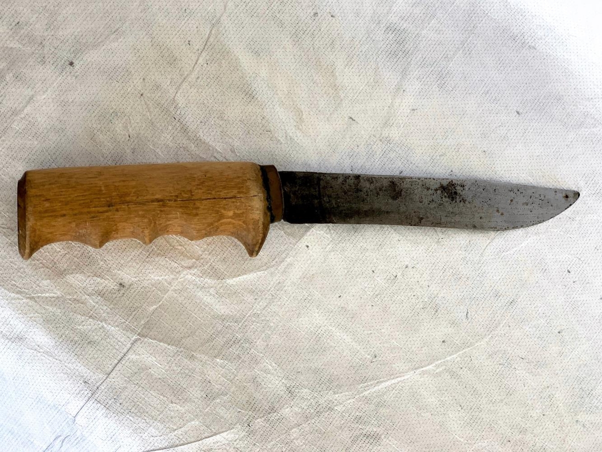Hnífur, með tréskafti og grópum fyrir fjóra fingur. Hannaður af Guðmundi Þorsteinssyni frá Sandvík. Gefinn Tungu heimilinu á Kópaskeri.