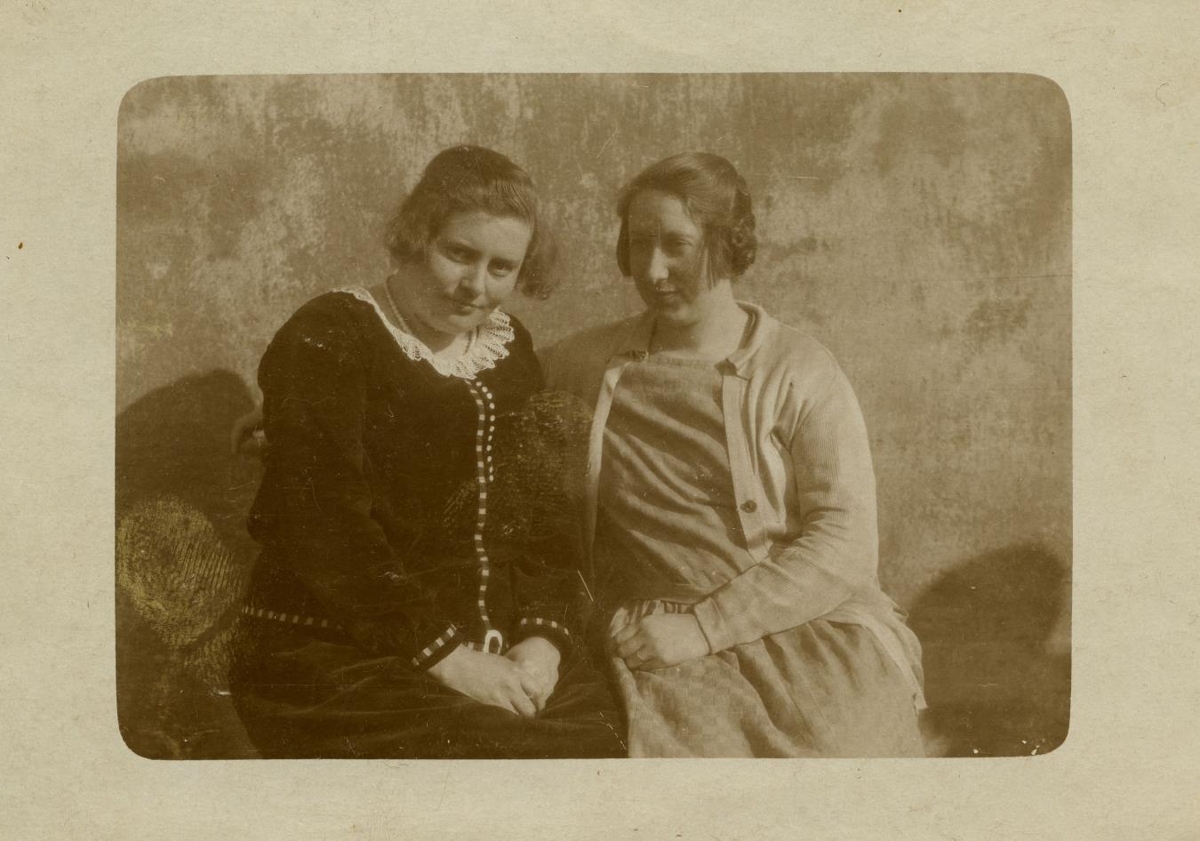 Tvær konur sitja saman undir húsvegg, frá vinstri Sigríður Húnbjörg Jónsdóttir og Þuríður Halldórsdóttir.