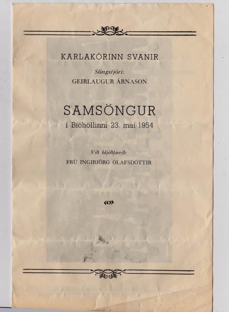 Samsöngur í Bíóhöllinni 23. maí 1954 : Karlakórinn Svanir, söngstjóri Geirlaugur Árnason, við hljóðfærið frú Ingibjörg Ólafsdóttir. - 3 bls